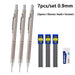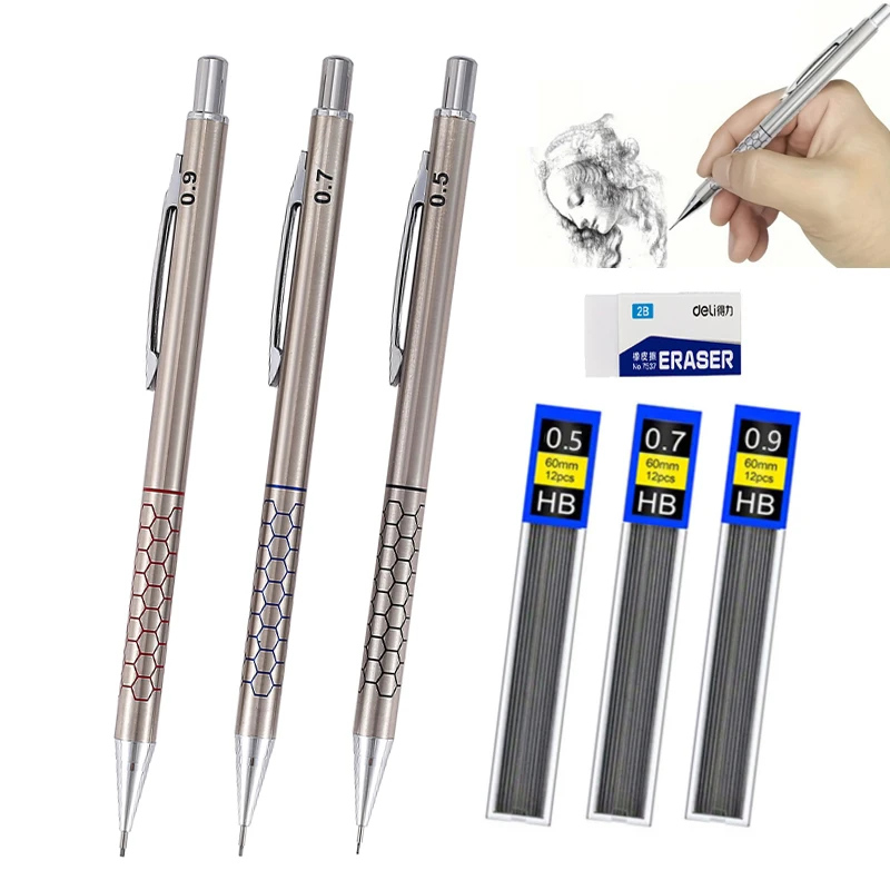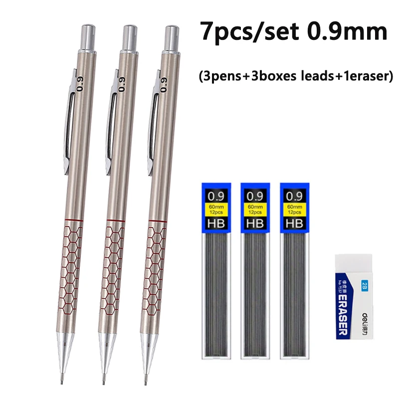 Complete 7-Piece Set – Includes 3 stainless steel mechanical pencils, 3 boxes of HB lead refills, and 1 eraser.